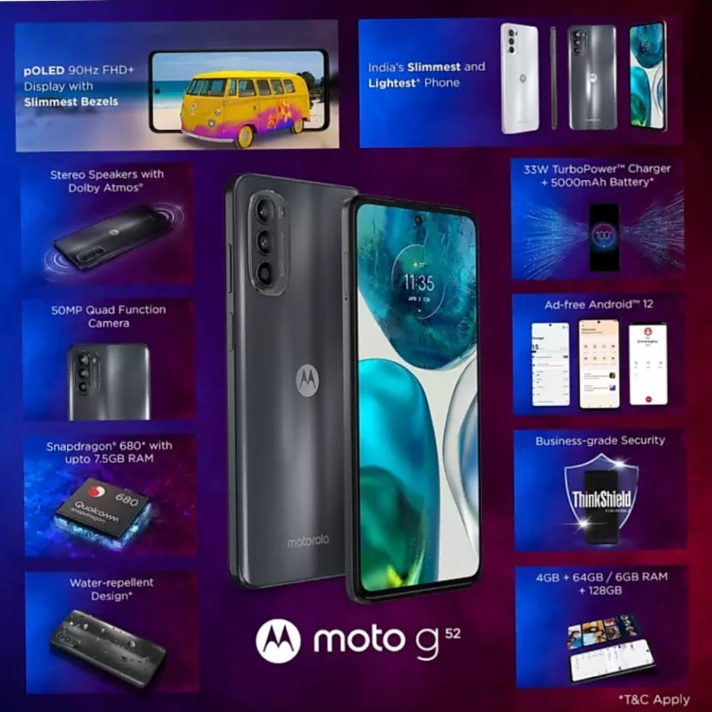 मोटोरोला Moto G52 स्मार्टफोन भारत में लॉन्च हो गया है। इसे 14499 रुपये की शुरुआती कीमत पर लॉन्च किया गया है। फोन में 6.6 इंच का फुल-एचडी+पोलेड डिस्प्ले 5000mAh की बैटरी और क्वालकॉम स्नैपड्रैगन 680 प्रोसेसर मिलता है।कहा जा रहा है कि यह स्मार्टफोन Redmi 10 Power, Oppo K10 और Realme 9i को टक्कर दे सकता है।